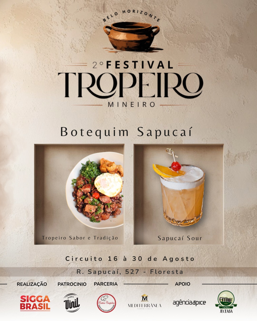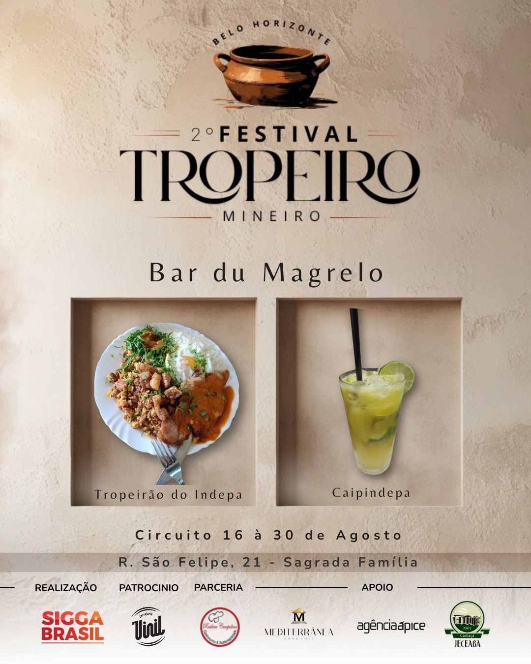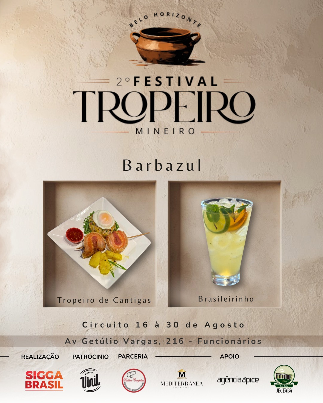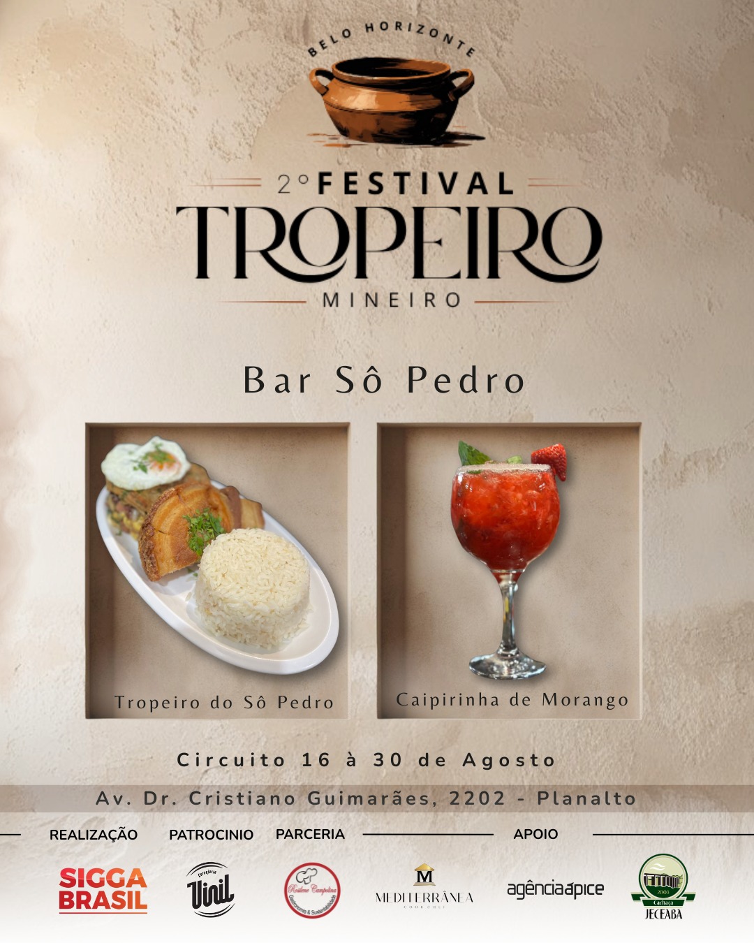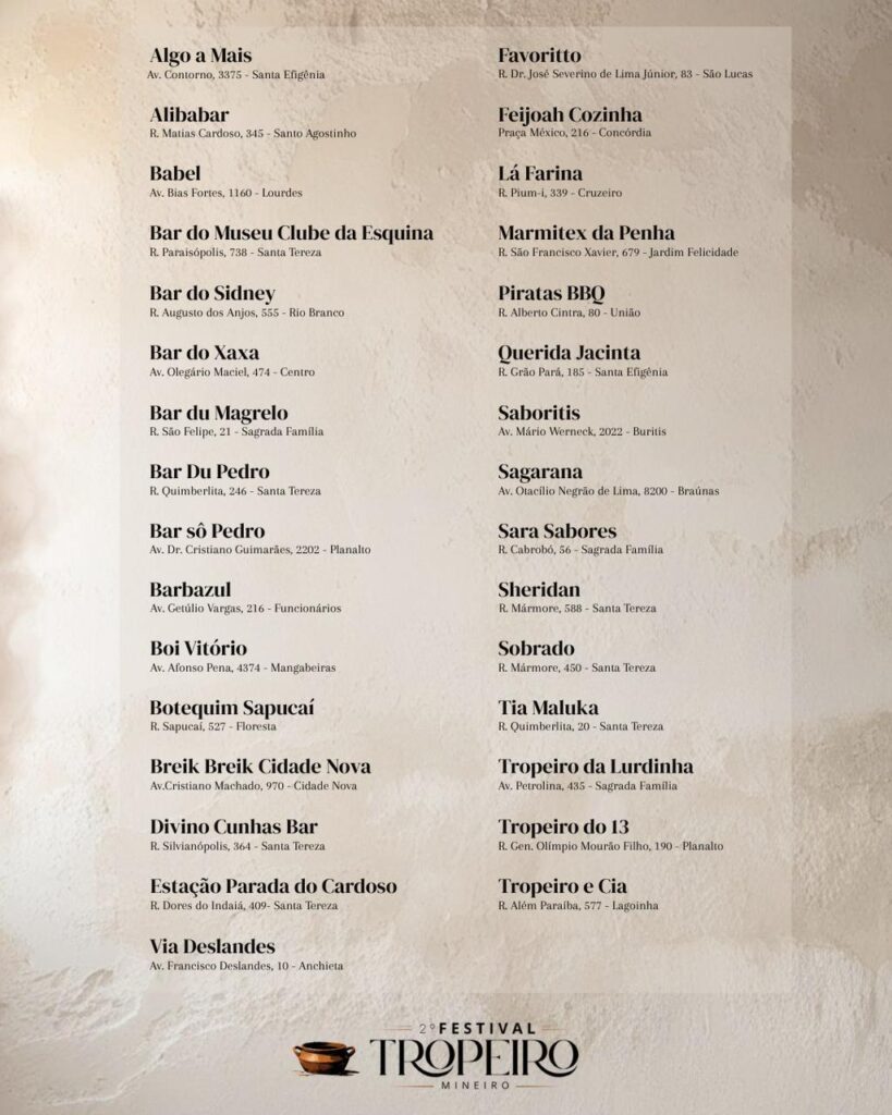 Os preços dos pratos variam de acordo com cada estabelecimento, mas há opções a partir de R$ 25. Participam do festival: Alibabar, Barbazul, Babel, Bar do Sidney, Bar do Museu Clube da Esquina, Bar do Xaxa, Bar Du Pedro, Bar Sô Pedro, Breik Breik, Boi Vitório, Botequim Sapucaí, Divino Cunhas Bar, Estação Parada do Cardoso, Favoritto, Lá Farina, Marmitex da Penha, Piratas Bar, Querida Jacinta, Sara Sabores, Saboritis, Sagarana, Sheridan, Sobrado, Tropeiro do 13, Tropeiro e Cia, Tropeiro da Lurdinha, Tia Maluka, Via Deslandes, Feijoah Cozinha, Algo a Mais e Bar du Magrelo.